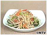 (1)、もやし(1袋)とせん切りにしたにんじん(3cm分)、3cm長さに切った万能ねぎ(1/2わ)はボールに入れ電子レンジで4分加熱します。 (2)、しょうゆ、ごま油、すりごま各大さじ1とにんにくのみじん切り少々を合わせ(1)の野菜とあえます。