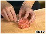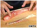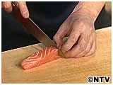 生鮭の皮と血合いの部分をきれいに取り除きます。こうすると臭みもとれます。