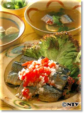 さんまのオイル漬け8~10切れをサニーレタスとともに器に盛り、刻んだ玉ねぎとトマトをたっぷりのせて食べます。玉ねぎは1/2個をみじん切りにして塩、こしょうをし、レモン汁大さじ2をかけて 15分おいてから、トマト1/2個のさいと目切りを合わせます。
