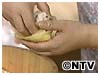 2)手前側を親指で広げ、あらかじめ、にぎっておいたすしめしを中に詰める。