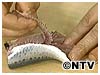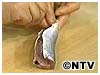 4)まず、尾の方に向かって背骨をつまむようにしてはずし、尾のところで骨を折ります。