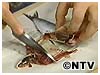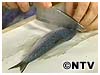 2)肛門から切り口に向かい、三角に包丁を入れ、腹ワタをかきだします。背骨の血合いのところに包丁で筋をいれます。