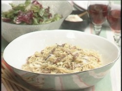 カルボナーラが残ったときは、卵1~2個を加えて混ぜ、スペインオムレツ風に丸く焼いてもおいしい。