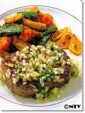 ステーキ肉は室温にもどしておくこと(中心まで火が通るように焼く10分前には冷蔵庫からだしておきます)。