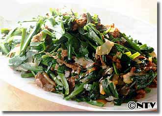 にらは根元部分から加えてしんなりしたら先の部分を入れて調味料を加えます。