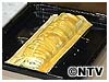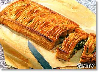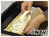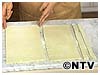 6)8cm幅の生地の上に具をのせ、10cm幅をかぶせます。左右に卵黄を塗ります。