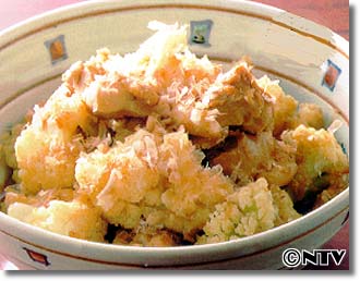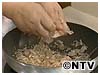 削りがつおは、このようにフライパンで炒って手でもみほぐしてから加えます。こうすると、生臭みがとれて香ばしくなります。