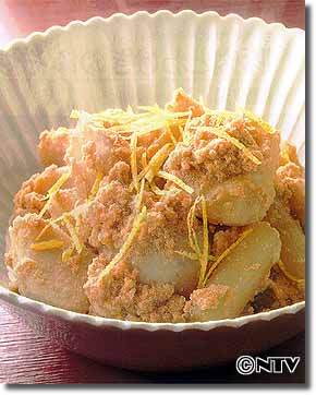 まず、里芋とうどを薄味で煮て、たらこを加えてさらに調味料を加えて濃い味に含めます。