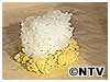 炒り卵はザルで熱いうちに裏ごしするとキメの細かいそぼろになります。(このひと手間が仕上がりを美しくします)