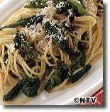 スパゲティ80gを塩少々を加えてたっぷりの湯でゆで上げ、ゆで汁をよくきって菜の花の茎のオリープ油炒めととあえ、塩、こしょうで味をととのえ、粉チーズ(パルミジャーノ・レジャーノ)をたっぷりふって食べます。