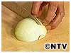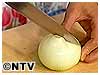 1) 玉ねぎの皮をむいて根元をつけたまま半分に切る。