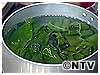 ゆでるとあっという間にグリーンに変わる。 これをすぐ、冷水にとって水気をふいて刻みます。 長く水につけるのはダメ。