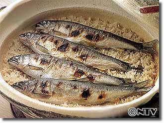 食卓では蒸らしあがりを一度みせてから(鮎の姿を)鮎をほぐして混ぜて供しましょう。
