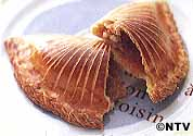チェリーのクリームフリット参照フランスの家庭では、余ったタルト生地は子どもたちのもの。好きなおやつを作ります。生地をのばしてアンズジャムをのせて、コーンフレークミックスを散らし、片側の縁に小麦粉水をぬり、半月に折ります。縁にナイフで飾りをつけ、表面にも筋を入れ、卵黄をりんごジュースでのばしてぬり、オーブンで色よく焼き上げます。