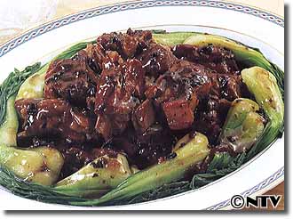 つけあわせのチンゲンサイは煮立てたスープの中に加え、ふたをして蒸し煮にし、一度返してから再びふたをしもう2~3分蒸し煮します。