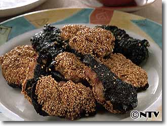 バットにごまを広げ、肉だねをスプーンで落とします。
