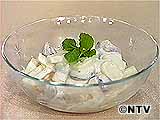 材料: プレーンヨーグルト(3/4カップ) マヨネーズ(大さじ3) 梨(1個) ぶどう(大粒のもの8~12個) レモン汁(少々)、ミントリーフ(適宜) 作り方 1)ぶどうは皮をむき半分に切って、種をとり、レモン汁をまぶして冷やしておきます。 2)冷やしておいた梨は8つ割りにして、皮と種を除き、5ミリ厚さに切り、バナナも5ミリ厚さに切ります。 3)ヨーグルト、マヨネーズを合わせて、1)、2)をあえ、器に盛り、ミントを飾ります。