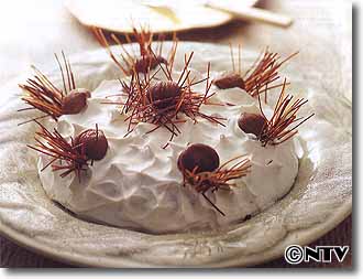 揚げたそうめんが栗のイガイガのようで可愛らしい。また、このそうめんの塩味が効いていて、ケーキの甘さとマッチしています。