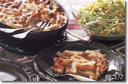 3)このシャバシャバの状態が大切。(マカロニがソースの中を泳いでいる感じ)ここでは煮つめないで、マカロニを温まれば、バターをぬったグラタン皿に流し入れる。