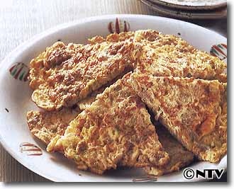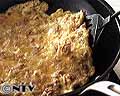 炒めた切り干し大根は、熱いうちに卵と合わせ、すぐに焼く。片面が焼けたらフライ返しなどを使ってくずさないように返す。