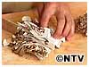 ソースのきのこをカリカリになるまで炒めるのがポイントです。まず、舞茸、にんにくをバターで3分くらい炒め、(ここはじっくりと)カリっとしてきたら、白ワイン、マスタード、パセリを加えます。