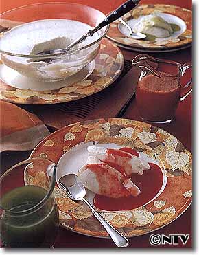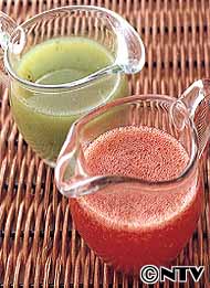 色鮮やかないちごソースとキーウィソース。 バルサミコ酢を加えるとまろやかな味になる。