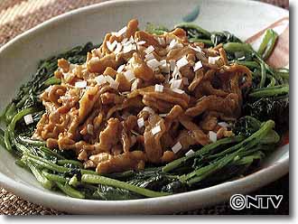 炒めものが濃い味なので、ほうれん草はスープを加えずに水で蒸します。