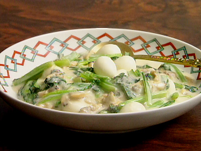 水溶き片栗粉でとろみをつけてからエバミルクを加え、さらにとろみをつけるのがポイントです。