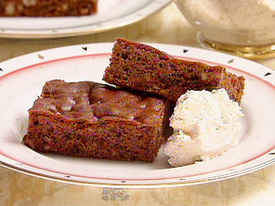 ブラウニーの粗熱がとれたら食べやすい大きさに切り分け、シナモンクリームを添えて食べます。