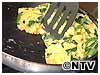 1)卵液を流し、半熟に火が通ったら半分に折る。
