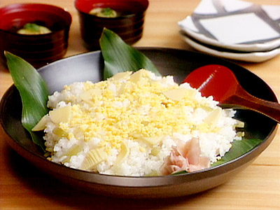 A えびフライ B 牛肉のアスパラ巻き 塩、こしょうした牛肉でゆでたアスパラガスを巻き、薄く小麦粉をつけ、フライパンで焼いてしょうゆ、みりんをからめる。 C プチトマト D たけのことふきの混ぜずし 炒り卵も混ぜて詰め、木の芽を散らす。