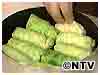 2)葉を中表にした上に肉だねをのせてひと巻きし、片端を折りたたみ最後まで巻く。