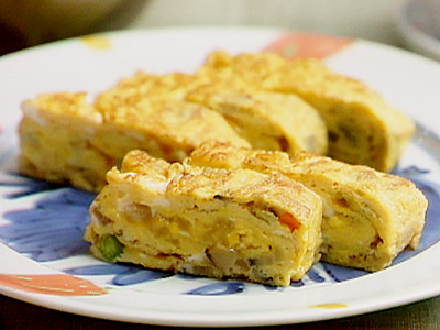 巻いた卵の下にも流し、4)と同様に手前に巻く。これをもう1~2度繰り返して焼き上げる。