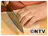 3)縦半分に切り(大きいときは3等分)、横におき包丁をねかせ間に切り込みを入れながらそぎ切る。