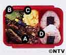 A 焼きさんが 電子レンジで温め直し、食べやすく切って詰める。電子レンジで火を通したしめじを添え、しょうゆを添える。 B チンゲンサイのごまあえ ゆでて1cm幅に切り、水気をよく絞り、しょうゆ、砂糖で調味したすりごまであえる。 C 炒り卵 溶き卵に砂糖、塩で味つけし、フライパンで炒りつける。 D 梅おにぎり ごはんにちぎった梅干しを混ぜ、にぎってのりをはる。