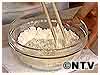 3) 1)に塩を加えて、2)を菜箸でおとしていきます。わかさぎのような形になるように落とす。