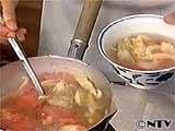 材料: ゆで豚のゆで汁(4カップ) 薄力粉(100g)、ぬるま湯(1/2カップ) トマト(2~3個)、みょうが(3個) 塩(小さじ1/2)、こしょう(少々)