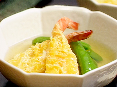 えびは火を通しすぎないことがポイントです。 卵液が散らないように、火加減は煮立てない程度にし、2度に分けて火を通します。一度に全量入れると、初めに入れたものに火が通りすぎてしまいます。