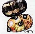 A 豚肉とメンマの当座煮 B かに巻き卵 かに風味かまぼこを芯にして卵焼きの要領で焼き、一口大に切る。 C 甘酢キャベツ ざく切りのキャベツをさっとゆでて水気をきり、せん切りしょうが、赤唐辛子各少々とともに甘酢に漬ける。 D 煮豆 E ふりかけおにぎり