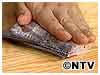 背ビレの取り方。まず両側に斜めに包丁を入れ、包丁で背ビレを押さえてひっぱり出します。
