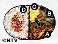 A 牛肉とみょうがの甘辛煮 一口大に切った牛肉に、だし汁、酒、みりん、しょうゆを加えて甘辛く炒りつけ、縦薄切りのみょうがを加えてさっと炒りつける。 B きゅうりとなすのごま酢 きゅうりとなすは薄切りにし、塩でもんで水気を絞り、砂糖、酢、すりごまであえる。 C 炒り卵/溶き卵を塩で調味し、炒りつける。 D ごはん/ふりかけをふる。