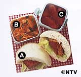 A ピタパンサンド タンドリーチキンを小さくそぎ切りにし、レタスとともにピタパンに詰める。 B にんじんサラダ にんじんをピーラーで薄切りにし、ちぎったパセリ、ひきごしょう、セパレートドレッシングであえる。 C りんごのクランベリージャムコンポート