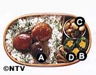 A つくね椎茸のくわ焼き ごはんの上に青のり粉をふり、たれをからめたくわ焼きをのせる。 B 春菊と黄菊ののり巻き 巻きすに焼きのりを広げ、ゆでた春菊を広げてのせ、ゆでた黄菊を手前にのせて巻き、食べやすく切る。 C 大豆と昆布の煮もの(市販品) D 椎茸の軸のきんぴら