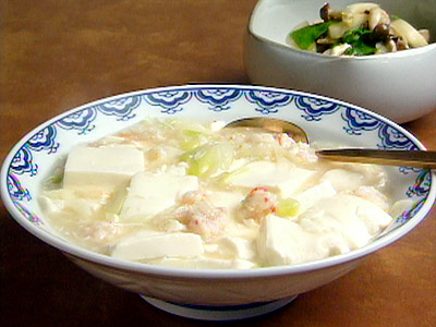 水溶き片栗粉を加えてとろみをつけてから、豆腐を煮るます。先にとろみをつけておくと、豆腐にスが入りにくい。