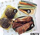 A スペアリブのはちみつレモン煮 B スティックサラダ にんじん、きゅうりをスティック状に切り、豆板醤入りのマヨネーズを添える。 C めはりずし すりごまとしょうゆを混ぜた削りがつおをご飯に混ぜ、おにぎりにして高菜漬けの葉で包む。