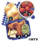 A 鶏手羽元のカレーから揚げ フライドポテトは2~3つに切り、牛乳をヒタヒタに加え、汁気がなくなるまで煮る。 B キャベツのコールスロー キャベツは大きめにちぎり、塩もみしてフレンチドレッシングであえる。 C パン D フルーツ いちご