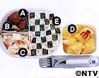 A 肉だんごの甘酢煮 揚げた肉だんごを煮立てた甘酢あんで煮る。甘酢あんは水に砂糖、酢、しょうゆ、トマトケチャップ、酒を合わせたもの。 B ピーマンときのこのソテー せん切りのピーマンと生椎茸を油で炒める。 C じゃが芋のサラダ 角切りにしてゆでたじゃが芋、にんじんに塩、こしょうをし、マヨネーズであえる。 D フルーツ パイナップル E ごはん のりをのせる。