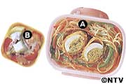 A ゆで卵のコロッケの巣ごもり 玉ねぎ、にんじん、ピーマンは細切りにし、油少々で炒め、3つに折ってゆでたスパゲティを炒め合わせて塩で調味する。弁当箱に詰め、2つに切ったコロッケを真ん中に入れ、粉チーズをふる。 B キーウイといちごのハニーヨーグルト フルーツを小さく切り、はちみつを混ぜたヨーグルトをかける。