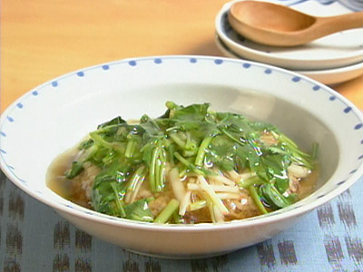 軸が太く短めで、根がついている。三つ葉の中でいちばん香りが強く、根はひげ根をそいできんぴらにするとおいしい。主産地は関東で、3~4月に出回る。