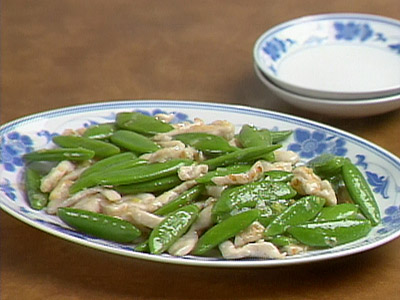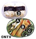 A 鶏肉とスナックえんどうの炒めもの B 春巻き 市販の冷凍春巻きを揚げる。 C ピーマンのごまあえ ピーマンは乱切りにしてさっとゆで、ごまじょうゆであえる。 D おにぎり 焼いた塩鮭の身をほぐし、白ごまとともにごはんに混ぜ、俵型ににぎってのりを巻く。